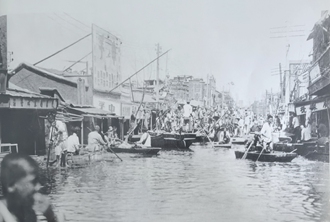 1939年8月,华北暴雨成灾,天津市区被汹涌的洪水包围。日军于7、8两日炸开南运河大堤,21日洪水从城南墙子河直灌市区,市区除少数高地外尽成泽国。图为南门外大街水情。